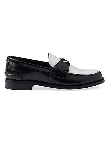 Контрастные оттенки подчеркивают классический силуэт этих лоферов, выполненных из качественной велюровой кожи. Дизайн, свидетельствующий о мастерстве бренда, украшен фирменным эмалевым логотипом в виде треугольника.