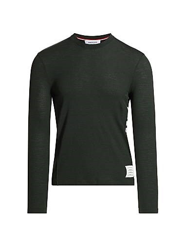 Этот лонгслив от Thom Browne выполнен из эластичной шерсти и отличается характерными 4-полосками бренда, а также логотипом на подоле.