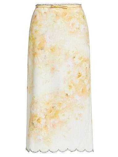 Юбка миди Crush от Zimmermann выполнена из цветочного льна и украшена поясом в виде банта, волнистым краем и отделкой с вышивкой.