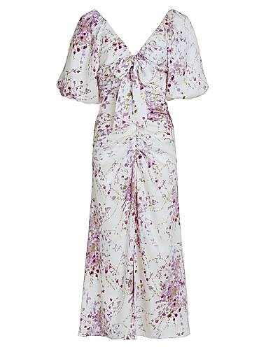 Платье Brenton от Cinq a Sept украшено игривым цветочным принтом Midsummer Bloom. V-образный вырез оформлен завязкой, а сборка спереди и короткие пышные рукава придают динамичный силуэт в виде буквы А.