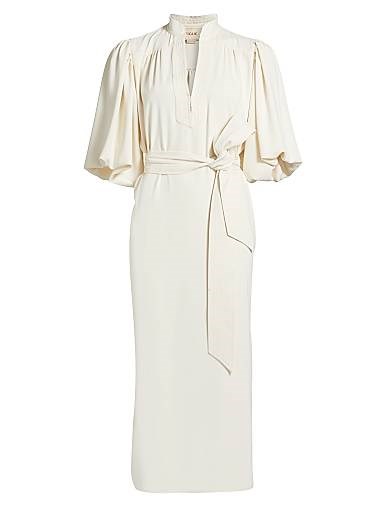 Платье миди Dani от Figue с пышными рукавами и завязкой на талии привлекает внимание своим стильным дизайном.