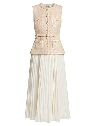 Это миди-платье с эффектом смешанных тканей от Self-Portrait сочетает в себе блестящий верх из пайеток и плиссированный шифоновый подол.
