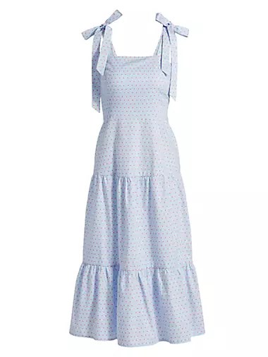 Это миди-платье имеет многослойный силуэт и украшено милым горошком.