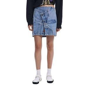 Дизайн, сшитый из различных элементов, придаёт этой мини-юбке фасона парео из потертого светло-голубого денима значительный винтажный шарм.
