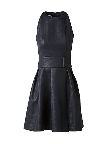 Мини-платье Akris punto выполнено из блестящей металлической ткани, имеет приталенный лиф с дартсами и расклешенную юбку А-силуэта с складками.