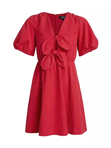 Это игривое мини-платье от If Only Studio имеет V-образный вырез, бантики на лифе и короткие пышные рукава.