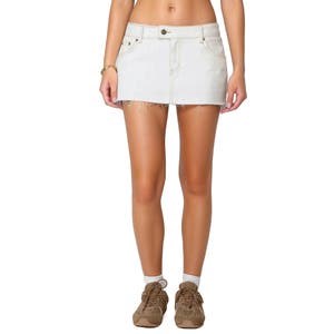 Мини-скорт с низкой талией украшен вышитыми бантиками на задних карманах. Изготовлен из денима без растяжки с необработанным краем.