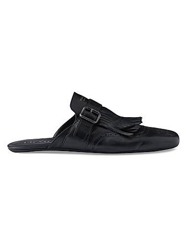 Мюли с ремешком и кисточками, выполненные из 100% телячьей кожи с перфорацией и тонкой резиновой подошвой от Prada.