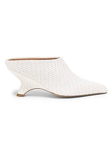 Mулы Shadow от Simkhai выполнены из плетеной веганской кожи и имеют острый носок, а также уникальный скульптурный каблук высотой 75 мм.