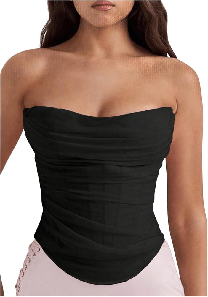 Дизайн: Без бретелек, асимметричный подол, рюшки, застежка-молния, элегантный корсетный топ.