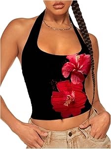Стиль: Топ на бретелях с цветочным принтом, вырезом, без рукавов, открытая спина и сборка, облегающий, укороченный.