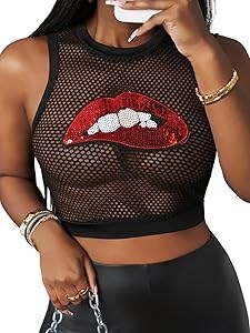 Молодежный сетчатый кроп-топ с блестками в виде губ Floerns, без рукавов, для вечеринок и концертов, дышащий