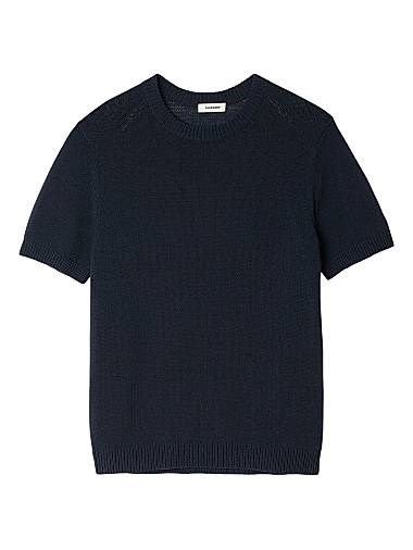 Легкая футболка из тонкой вязки с круглым вырезом и короткими рукавами.