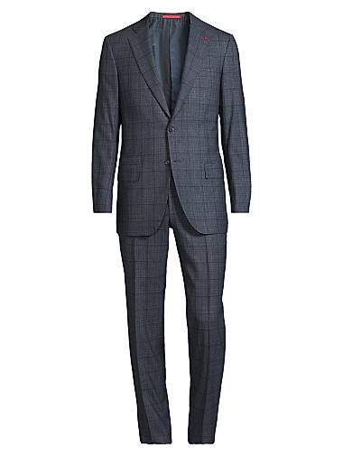 Из коллекции Mouline Comfort. Костюм Isaia, выполненный из стрейчевой шерсти, отличается клетчатым принтом и включает пиджак с вырезными лацканами и брюки с стрелками.