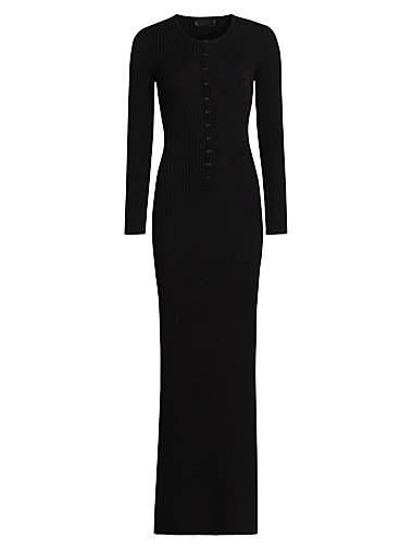 Изготовлено из ребристой трикотажной шерсти, плотно облегающей фигуру, это платье макси-длины имеет круглый вырез и застежку на пуговицы.