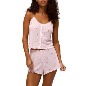 Независимо от места, ваши сны будут немного слаще в этих пижамах с эффектом точки, состоящих из бретелки на кнопках и соответствующих шорт.
