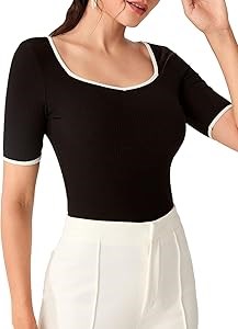 Характеристики: ребристая вязка, контрастная отделка, вырез в форме сердца, короткие рукава, облегающий фасон. Подходит для повседневной носки, работы, офисной обстановки, встреч, походов, покупок и семьи.