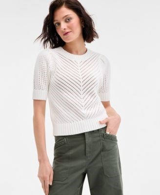 Уникальная диагональная открытая вязаная фактура придаёт текстуру и интерес нашему пуловеру с короткими рукавами-пухлями.