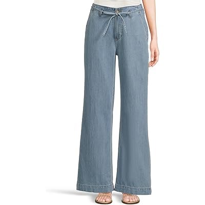 Джинсы-брюки высокой посадки с широкими штанинами и поясом на завязках.