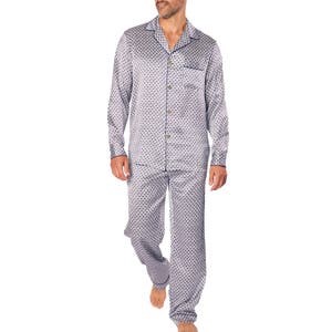 Поднимите свой комфорт сна на новый уровень с роскошными пижамами из мягчайшего шелка Тучкового, украшенными стильным узором фоулард и продуманными деталями, такими как манжеты на кнопках и окантовка.