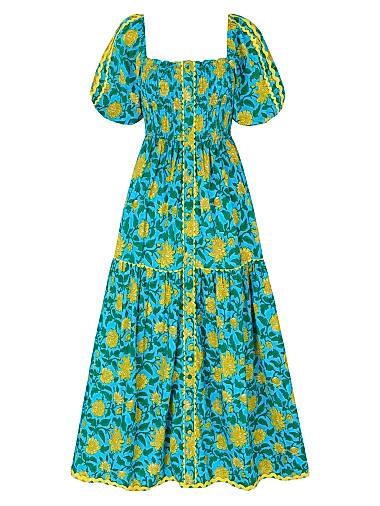 Платье Colette привлекает внимание открытым квадратным вырезом и игривыми рукавами-буфами. Оно выполнено вручную в стильном принте Hibiscus Jaal и оснащено фиксированной планкой с пуговицами, отделкой из рик-рака и юбкой с асимметричным подолом.