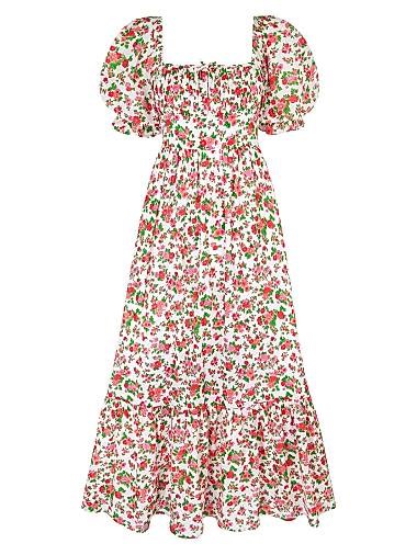Платье Симона изготовлено из органического хлопка и украшено нежным винтажным цветочным принтом. Оно имеет рукава-фонарики, эффектный квадратный вырез с рюшем на груди, облегающий пояс и сборку на спинке для удобной посадки.