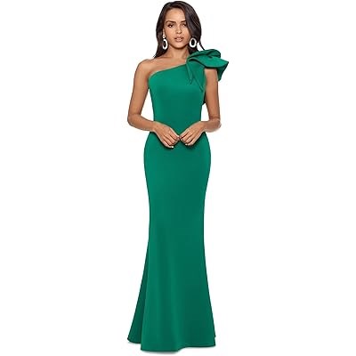 Платье имеет асимметричный дизайн с одним плечом и длинный цветочный элемент на плече. Застежка на спинке и силуэт, подчеркивающий фигуру, создают элегантный и утонченный образ.