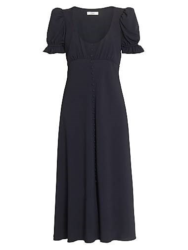 Платье в стиле А-силуэта с изящными пуговицами спереди и талией в стиле Джульетты. Крой с короткими расклешенными рукавами придаёт образу романтичность и легкость, а добавление шелка добавляет нотку роскоши.