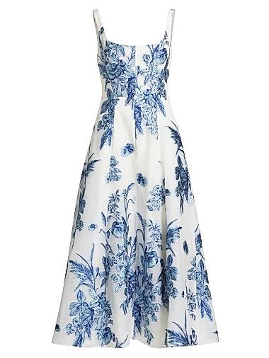 Миди-платье Lela Rose в стилевом крое «А» отличается цветочным жаккардовым узором и полноразмерной юбкой в форме круга.