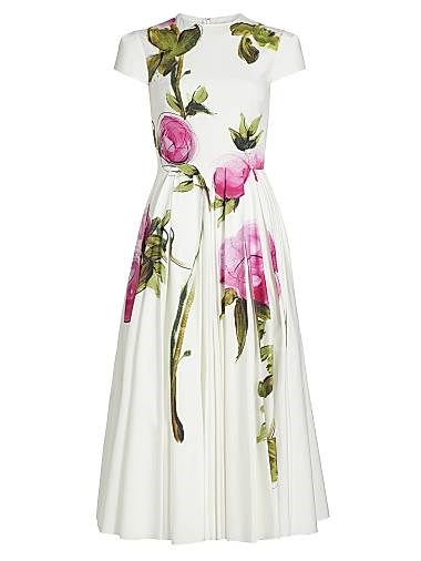 Платье миди из растягивающегося хлопкового поплина от Oscar de la Renta выполнено с живописным цветочным принтом и юбкой плессированной.