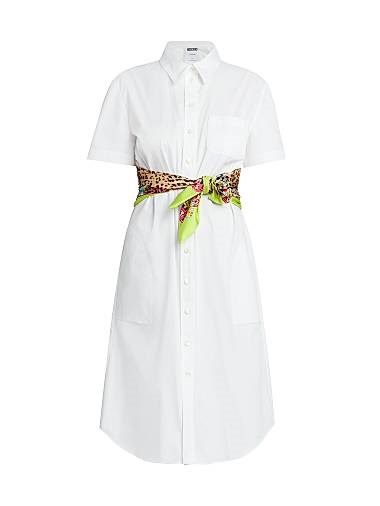 Это платье-рубашка от Moschino выполнено из эластичного хлопка и украшено ярким поясом на талии.