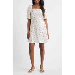 Объемные рукава-фонарики и расклешенная юбка подчеркивают силуэт этого платья с квадратным вырезом и легкой открытой спиной, оформленной элегантной завязкой.