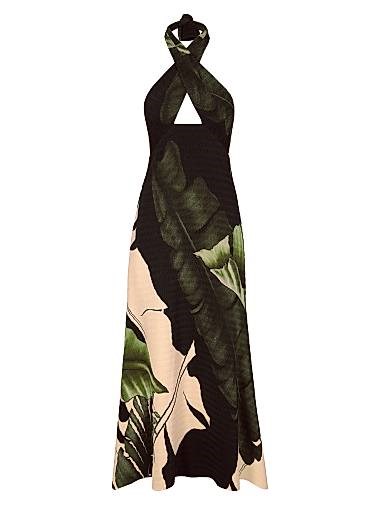 Из коллекции Fermina. Платье Elegant Expedition от Johanna Ortiz выделяется скульптурным воротником-галстуком и ярким тропическим принтом. Выполнено из текстурированной ткани, эта модель имеет большой вырез на лифе.