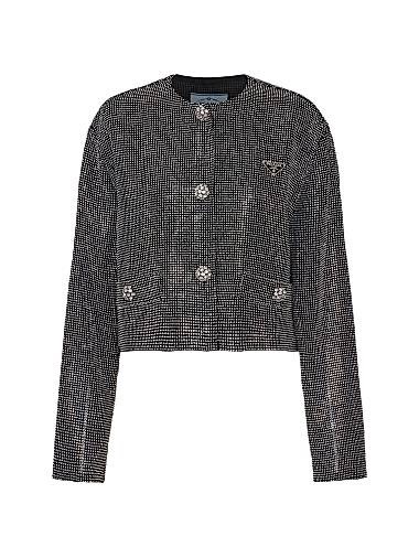 Приталенная куртка с однотонной застежкой и камнями Swarovski от Prada, круглый вырез