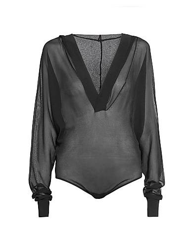 Прозрачное боди с капюшоном и глубоким V-образным вырезом от Alaia, длинными рукавами, Италия