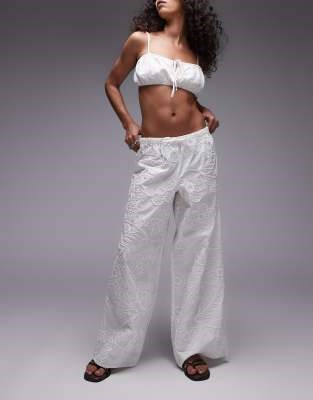 Прямые белые брюки Topshop с цветной вышивкой, поясом на шнурке и завышенной талией