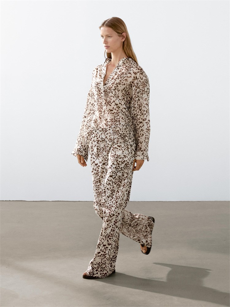 Прямые хлопковые брюки с анималистичным принтом и завязывающимся поясом от Massimo Dutti