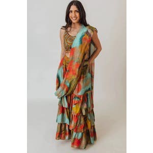 Готовое к носке сари с каскадными воланами и прикрепленным пallu органично соединяет традиции и современный стиль.