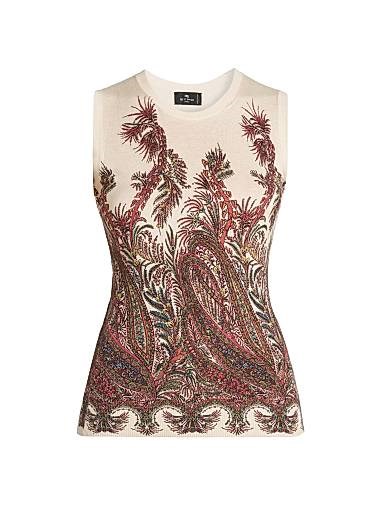 Топ из итальянского шелка и кашемира от Etro с фирменным узором пейсли. Этот прилегающий фасон имеет круглой вырез и безрукавный силуэт.