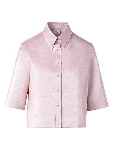 Рубашка Akris punto в форме коробки с А-образным силуэтом выполнена из смеси хлопка и льна с металлизированным переплетением, что придаёт ей блеск. Модель с воротником на пуговицах и рукавами длиной до локтей включает застёжку на пуговицы.
