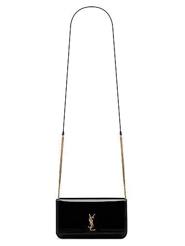 Saint Laurent Сумка-держатель для телефона из лакированной кожи с отделкой Cassandre и плечевым ремнем из кожи и цепочки