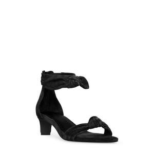 Изящные акценты и тонкий бантик подчеркивают элегантное очарование мягких замшевых сандалий на низком каблуке, оснащенных задней молнией для удобного снятия и надевания.