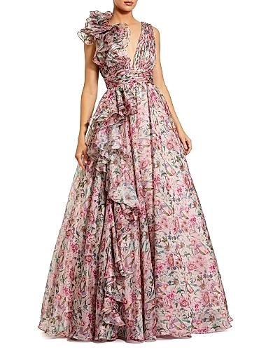 Сарафан с цветочным принтом и V-образным вырезом из шифона от Mac Duggal, без рукавов, с открытой спиной и рюшами