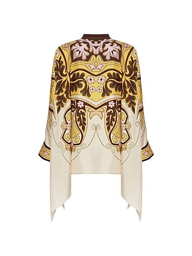 Модный основополагающий элемент гардероба, наша великолепная шелковая блузка Foulard — это произведение искусства в одежде. Часть блузки, часть пончо, она выполнена из струящегося итальянского шелка в стильном фасоне с эффектом водопада, который отлично сидит на любых формах и размерах. Она свободно свисает с рук с корейским воротником и пуговицами спереди, создавая красивую основу для наших принтов ручной работы, включая этот ультрамодный принт, вдохновленный эпохой Ренессанса.