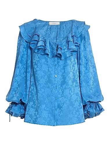 Очаровательная шелковая блузка от Chloe с многоуровневыми рюшами на округлом вырезе и длинными лонгсливами.