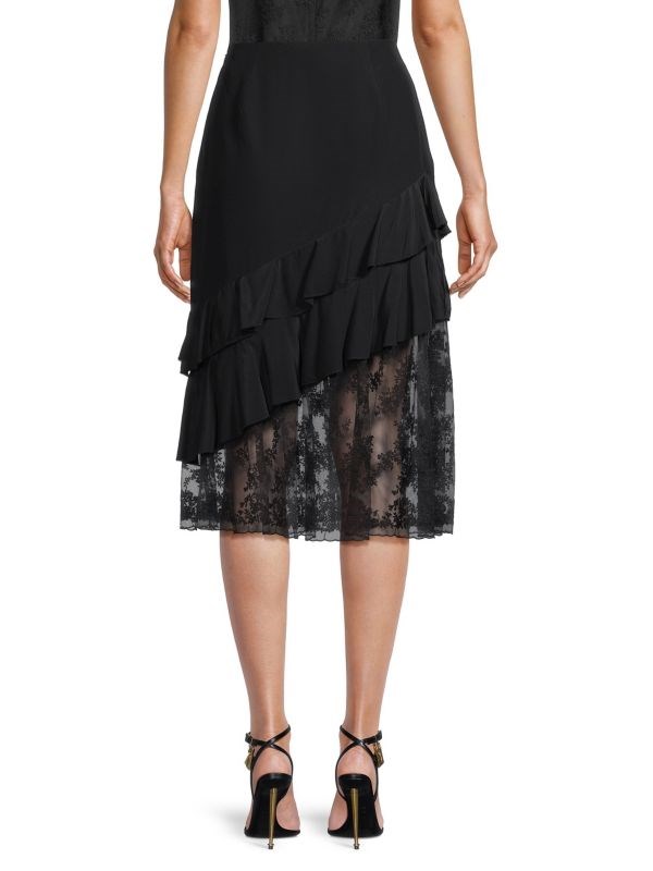 Шелковая миди-юбка Jason Wu выполнена в А-силуэте с асимметричными рюшами и вышитым низом.