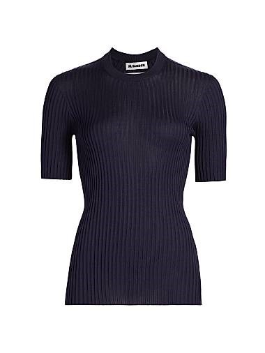 Топ с рибаными узорами, выполненный из мягкого шелка, отличается классическим круглым вырезом и облегающим силуэтом.