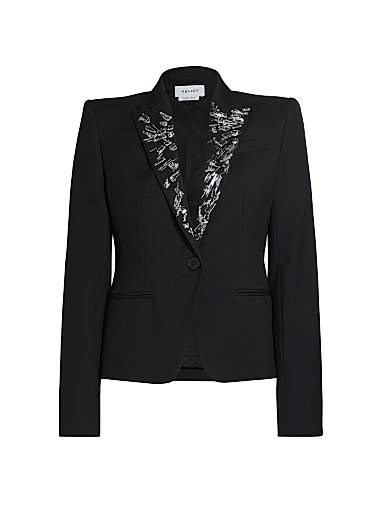 Жакет McQueen идеально подходит для создания стильного силуэта. Лацканы украшены вышитым и бусиновым мотивом, напоминающим разбитое стекло.