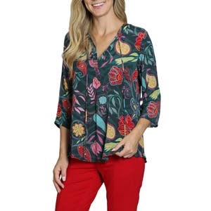 Добавьте немного художественности в ваш день с этим легким шифоновым топом, который привлекает внимание своим ярким принтом, завязками и закругленным подолом с эффектом хай-лоу.
