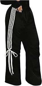 Брюки с боковыми полосками, бантом, резинкой на талии, высокой посадкой и широкими штанинами. Модная свободная модель.